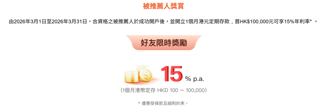 合資格之被推薦人於成功開戶後,即可以18% p.a.之年利率,購買「一個月港元定期存款」產品。此特惠產品之適用存款金額為港幣100元至50,000元。