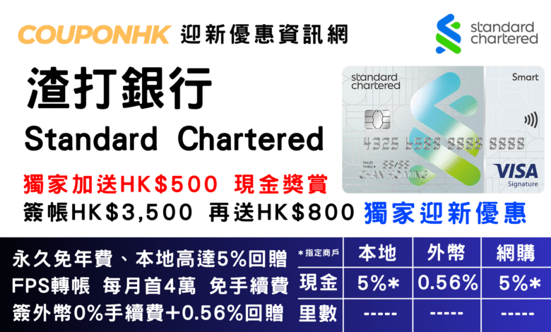 | CouponHK 邀請碼額外迎新 | 2026年1月1日至1月15日期間,新客戶成功申請免簽賬 額外HK$500現金回贈,獎賞由渣打提供。 |