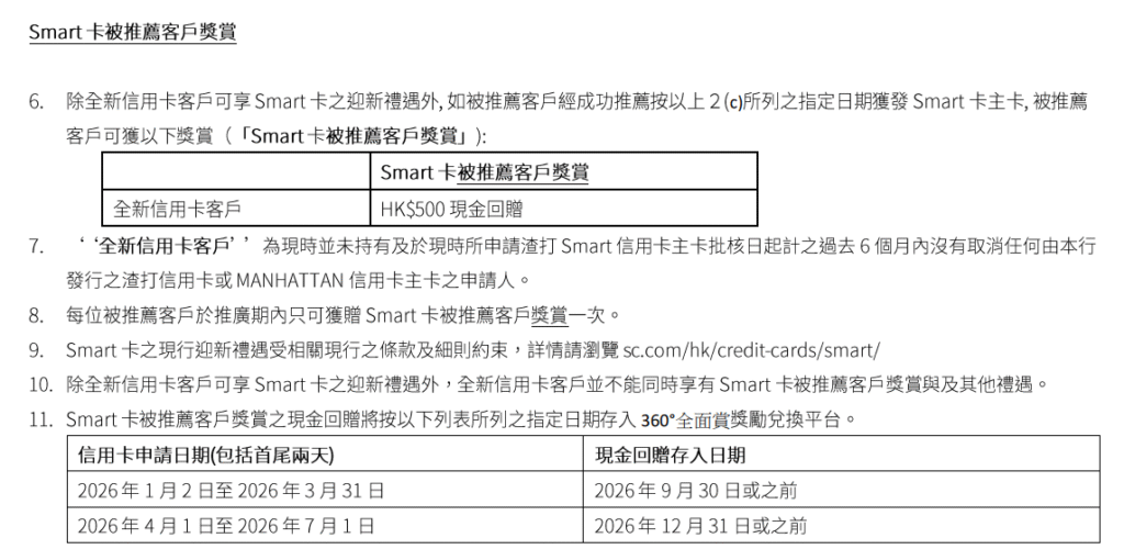 Smart 卡被推薦客戶獎賞全新信用卡客戶 HK$900 現金回贈 - “全新信用卡客戶”為現時並未持有及於現時所申請渣打 Smart 信用卡主卡批核日起計之過去 6 個月內沒有取消任何由本行發行之渣打信用卡或 MANHATTAN 信用卡主卡之申請人。